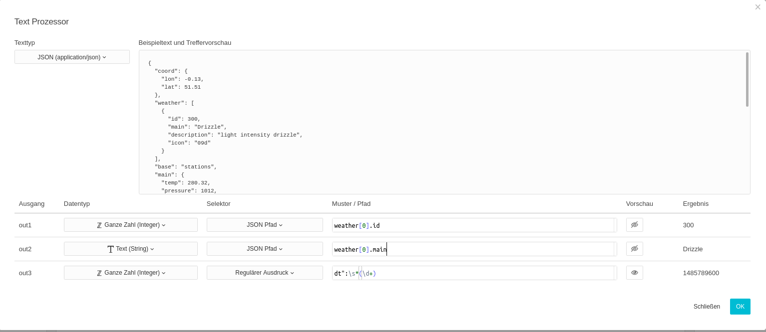 Pro Ausgang existiert eine Zeile mit welcher über die jeweiligen Muster/Pfade die gewünschte Elemente aus dem Text gefiltert werden können. Die jeweiligen Ergebnisse zum angegebenen Text sehen Sie in der rechten Spalte. Im Beispiel handelt es sich um eine Ausgabe von Openweathermap, die im JSON-Format vorliegt. Jedem Ausgang wird ein Datentyp zugewiesen in den der gefundene Wert gewandelt wird. Ist die Ausgabe im gewählten Datentyp nicht möglich, wird nichts ausgegeben. Wird zu einem Ausgang kein Ergebnis ermittelt, wird ebenfalls nichts ausgegeben.
